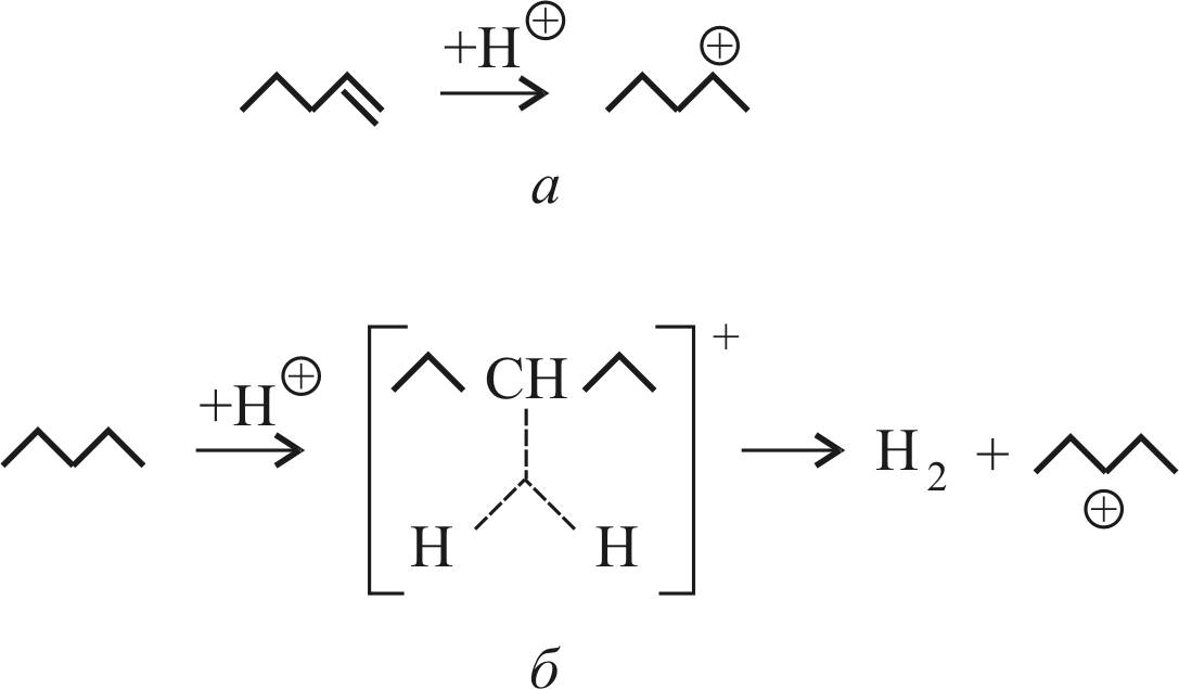 Значительная разница в энергиях связи (394–239 = 155 кДж/моль) делает возможным образование карбениевого иона из алкана лишь при использовании твердых суперкислот, например, Н-морденитов с силикатным модулем около 20, в условиях же платформинга подобный механизм не реализуется.