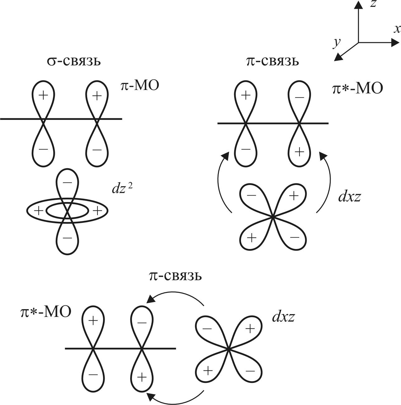 Атомными орбиталями, удовлетворяющими этому требованию, являются dz2– и dxz-орбитали переходного металла.
