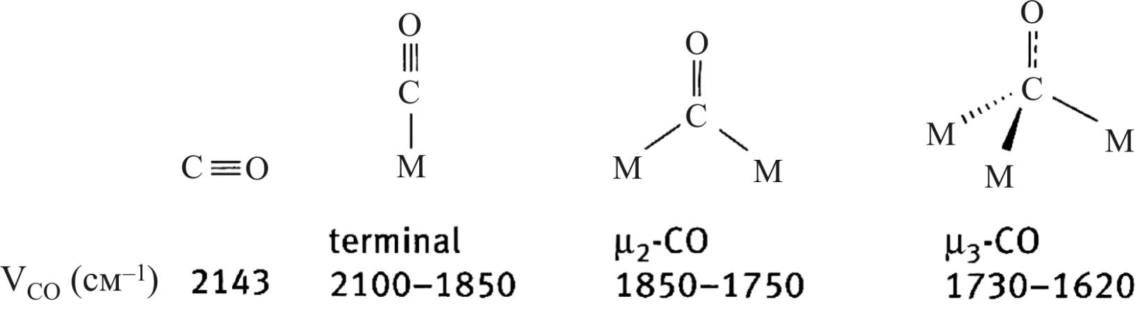 Порядок связи в результирующей структуре находится между 3 и 2, то есть меньше, чем в исходной молекуле, что также свидетельствует, что образование связей с атомом металла приводит к ослаблению связи в молекуле СО. При переходе от концевых к мостиковым группам связь в молекуле СО ослабевает еще больше, что проявляется в смещении ИК-поглощения в длинноволновую часть спектра (рис. 23) [37].