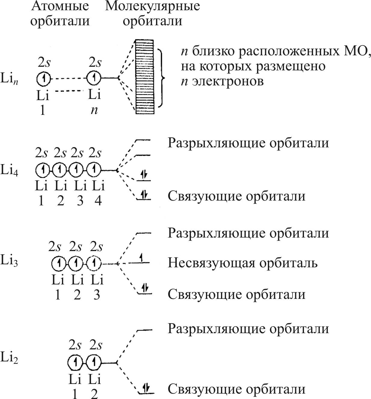 На рис. 24 представлено образование s-зоны для n атомов лития. Аналогичным образом формируются s-, p– и d-зоны для d-элементов.