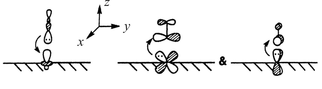 Как было показано в предыдущем рассмотрении хемосорбции молекулы СО на никеле, вакантная орбиталь адсорбата имеет более высокую энергию, чем уровень Ферми. Это справедливо и для других молекул, включая углеводороды.