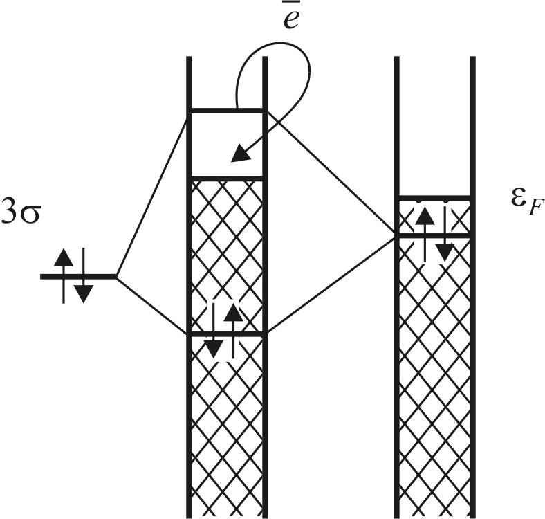 При приближении молекулы к поверхности возникает взаимодействие между 3σ-орбиталью и заполненными орбиталями d-зоны, которое приводит к расщеплению исходных уровней энергии с образованием двух новых энергетических уровней, соответствующих связующей и разрыхляющей орбиталям.