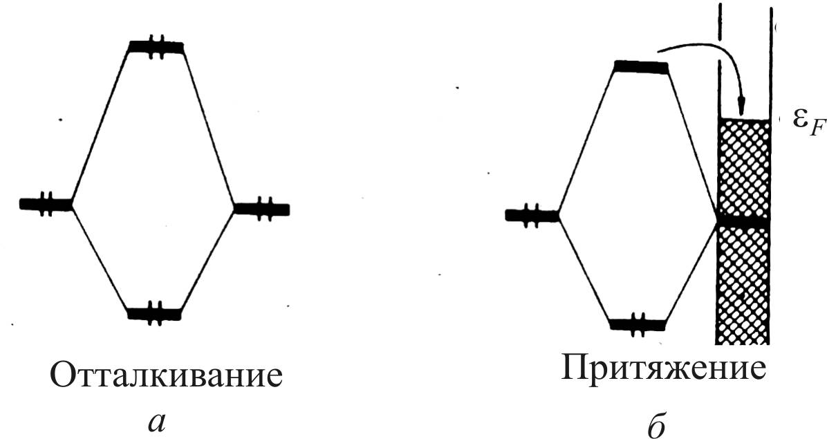 В случае взаимодействия молекул нетто-результат 4-электронного 2-орбитального взаимодействия однозначен – отсутствие связывания из-за заполнения образующейся разрыхляющей орбитали. При взаимодействии с d-зоной этот результат зависит от того, насколько сильным будет расщепление уровней энергии. Чем ближе уровни энергии орбиталей и чем ближе молекула подходит к поверхности, тем больше интеграл перекрывания орбиталей и энергия стабилизации, определяющая расщепление.