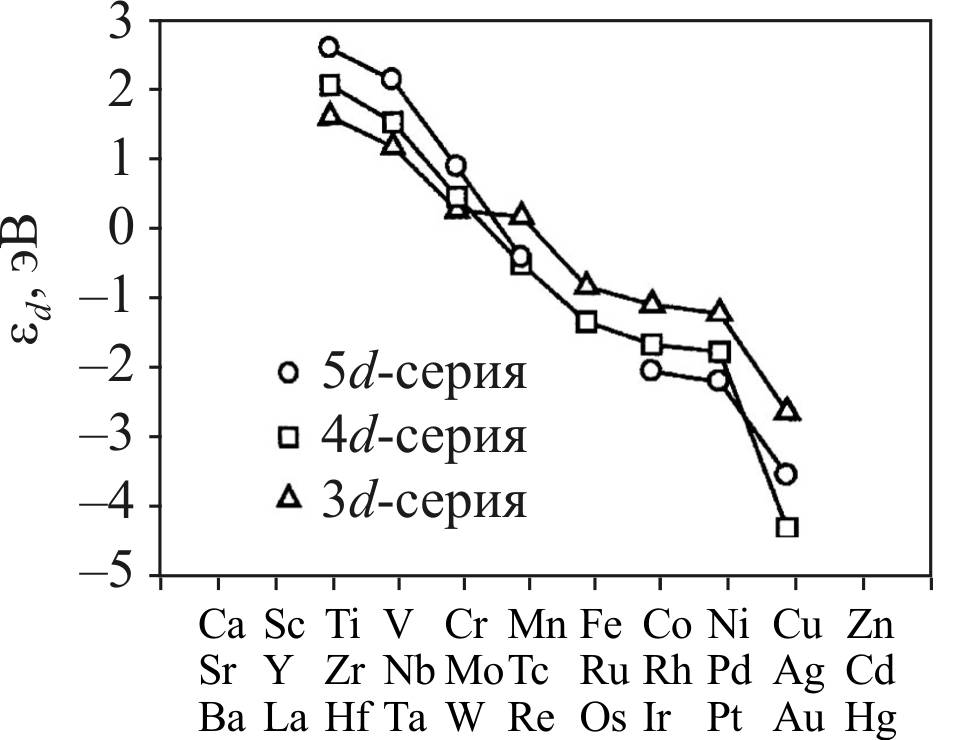 Полученные закономерности справедливы и для металлов второй и третьей переходных серий d-металлов, а также при перемещении внутри группы сверху вниз, что представлено на графике ниже для положения центра d-зоны [26].