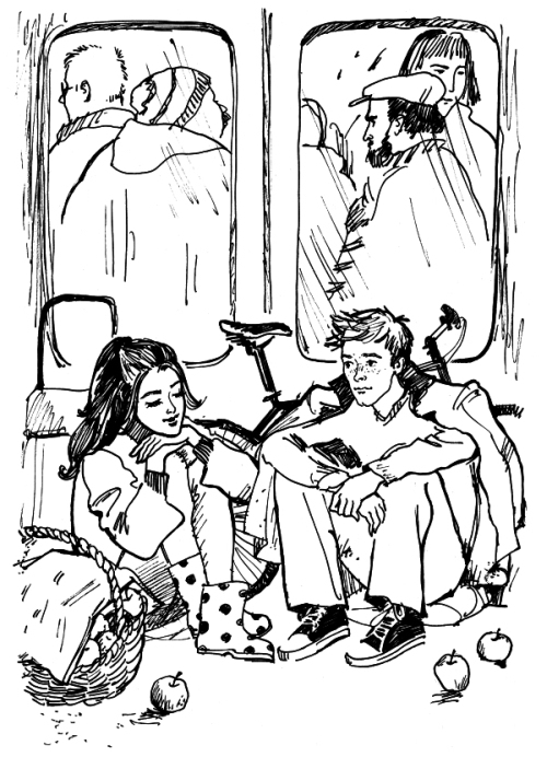 Гражданин в ответ недовольно приподнялся и корзину с яблоками поставил на Катю. Колюня боднул его в спину.