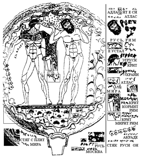 Неявные надписи начинаются с рассмотрения волос головы и бороды Атланта. Волосы головы читаются в первую очередь, и на них начертано слово РУСЬ. А на бороде, переходя на левый бакенбард – слово РИМ. Это – очень важные слова. Из них следует, что весь античный мир держался на двух опорах, где Рим оказывался лишь второй страной в мире, тогда как первой была Русь. В наши дни, когда мы изучаем мировую историю, в ряде курсов историю этрусков могут опустить, тогда как история Рима изучается обязательно. Однако никто и нигде не говорит о том, что еще более могущественной страной была Русь; о ней умалчивают вплоть до Киевской Руси. – Над головой Атланта в рамочке можно прочитать выражение Е УСТАЛ. Иными словами, господство Руси было древнее, господство Рима тоже продолжалось много веков, и Атлант устал. Ясно, что для реконструкции русской истории содержание этого этрусского зеркала весьма важно.