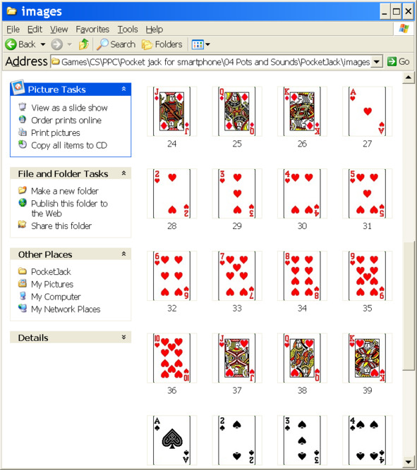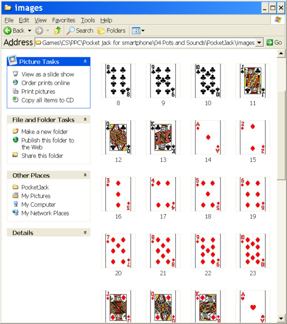 Видно, что в этом варианте проект имеет имя PocketJack, папка с файлами карт имеет имя images, а в массиве cardImages все файлы карт с именами «dispNo» должны иметь расширение (.gif).