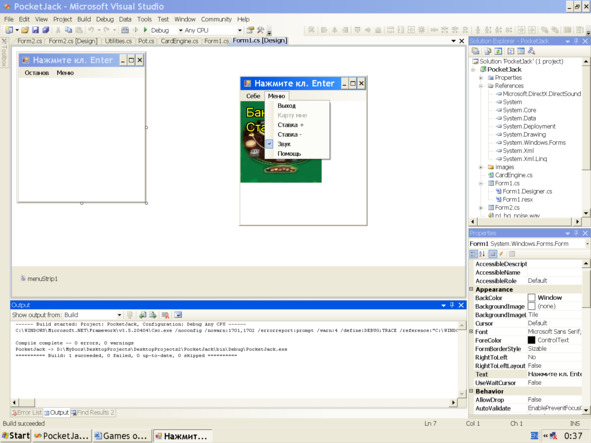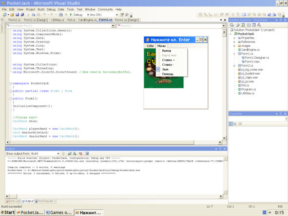 System.Reflection.Assembly asm =System.Reflection.Assembly.GetExecutingAssembly ();loadingImage = new Bitmap(asm.GetManifestResourceStream ("PocketJack.images.loading.gif»));bankImage = new Bitmap(asm.GetManifestResourceStream ("PocketJack.images.bank.jpg»));mode = GameMode. LoadingDisplay;this.Visible = true;В этом коде в строкеPocketJack.images.loading.gifпеременная PocketJack означает имя проекта (или пространства имён),