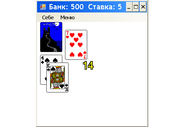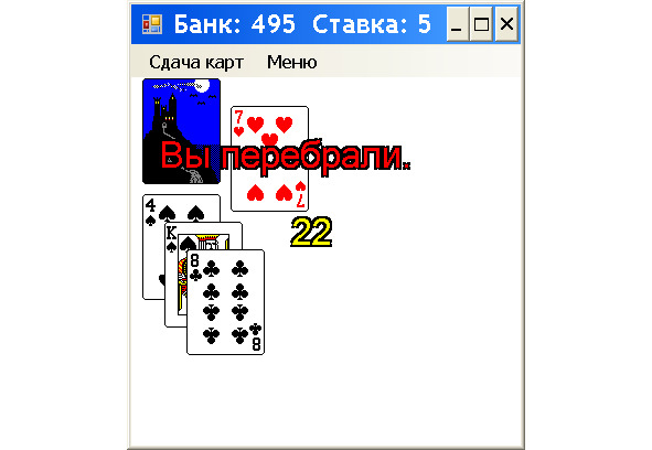 Отметим, что метод BlackJackScoreHand каждый раз возвращает счёт «руки игрока» (playerHand). После этого метод Invalidate перерисовывает форму Form1, точнее, перерисовывает карты и обновляет счёт обоих игроков. Аналогично в меню maneMenu1 имеется команда «Себе», по которой банкомёт набирает карты себе (после игрока).
