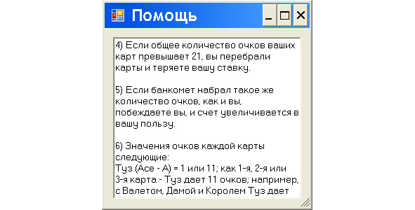 Сформулируем правила данной компьютерной карточной (из 52 карт) игры в очко, которые далее будут также записаны в справочную форму Form2, выводимую после выбора команды Помощь из меню элемента управления MenuStrip на главной форме Form1.