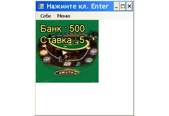 4. После запуска игры на форме появляются команда Себе и команда общего Меню (рис. 1.10), приведённый выше рисунок loading.gif, а затем фон игры в виде приведённого выше изображения bank.jpg и начальный счёт игры: