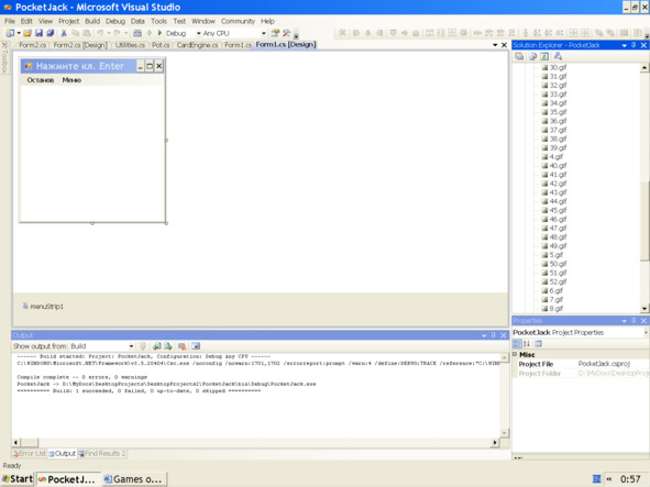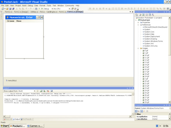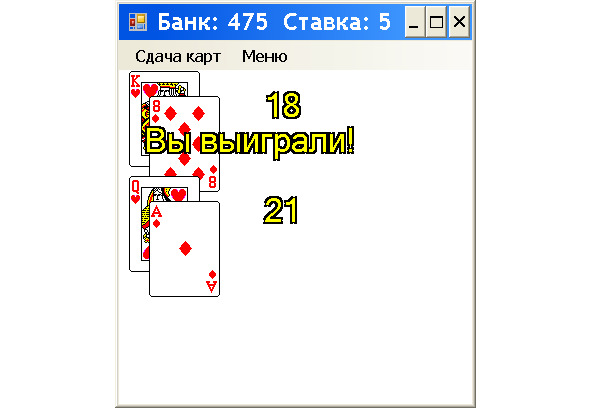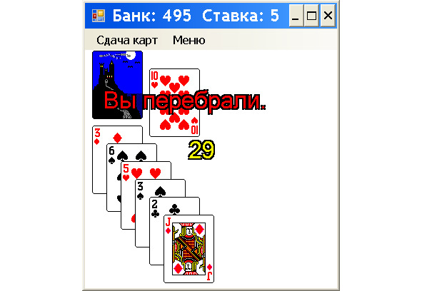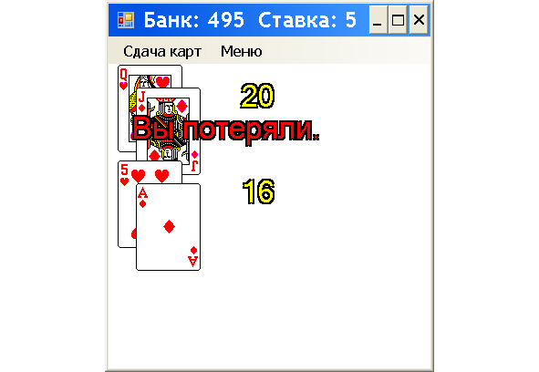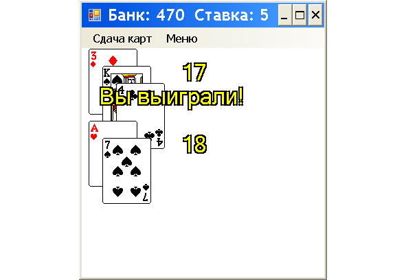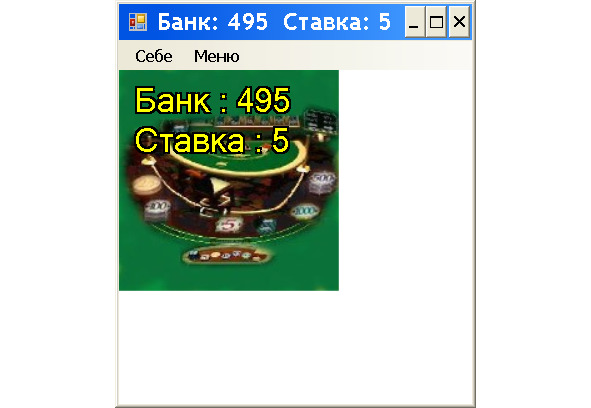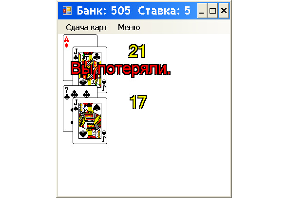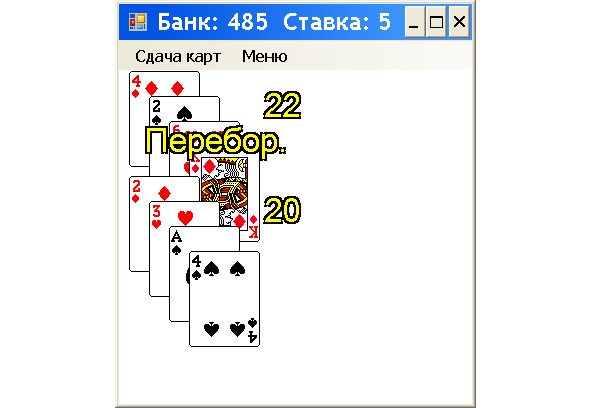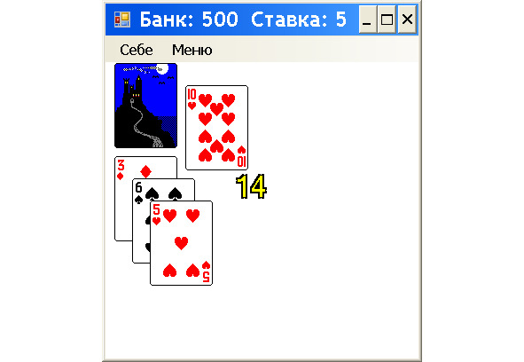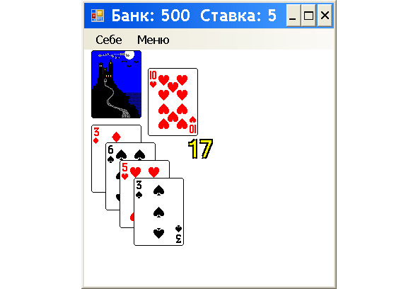 //Shoe of cards:CardShoe shoe;CardHand playerHand = new CardHand ();Card dealerHoleCard;CardHand dealerHand = new CardHand ();//Bank of a game:Pot pot;//We declare an object for a help form:Form2 helpForm;Image loadingImage = null;Image bankImage = null;public enum GameMode{LoadingDisplay,PlacingBets,PlayerActive,PlayerWon,PlayerBust,PocketJack,DealerActive,DealerWon,DealerBust,Push}GameMode modeValue;GameMode mode{get{return modeValue;}set{switch (value){case GameMode. LoadingDisplay:BetMinusToolStripMenuItem1.Enabled = false;BetPlusToolStripMenuItem. Enabled = false;HitMeToolStripMenuItem. Enabled = false;StayToolStripMenuItem. Text = «Point»;StayToolStripMenuItem. Enabled = false;MenuToolStripMenuItem. Text = «21»;MenuToolStripMenuItem. Enabled = false;break;case GameMode.PlacingBets:BetMinusToolStripMenuItem1.Enabled = true;BetPlusToolStripMenuItem. Enabled = true;HitMeToolStripMenuItem. Enabled = false;StayToolStripMenuItem. Text = «Себе»;StayToolStripMenuItem. Enabled = true;MenuToolStripMenuItem. Text = «Menu»;MenuToolStripMenuItem. Enabled = true;break;case GameMode.PlayerActive:BetMinusToolStripMenuItem1.Enabled = false;BetPlusToolStripMenuItem. Enabled = false;HitMeToolStripMenuItem. Enabled = true;StayToolStripMenuItem. Text = «Take a card to yourself»;StayToolStripMenuItem. Enabled = true;MenuToolStripMenuItem. Text = «Menu»;MenuToolStripMenuItem. Enabled = true;//Disturbing noise of the support groups//surrounding the player://not single, but continuous Looping;Assembly a = Assembly.GetExecutingAssembly ();Stream s =a.GetManifestResourceStream («PocketJack. pj_bg_noise. wav»);SoundPlayer player = new SoundPlayer (s);player.PlayLooping ();break;case GameMode.PlayerWon:BetMinusToolStripMenuItem1.Enabled = false;BetPlusToolStripMenuItem. Enabled = false;HitMeToolStripMenuItem. Enabled = false;StayToolStripMenuItem. Text = «Distribution of cards»;StayToolStripMenuItem. Enabled = true;MenuToolStripMenuItem. Text = «Menu»;MenuToolStripMenuItem. Enabled = true;//An applause in our address for a prize in cards:Assembly a1 = Assembly.GetExecutingAssembly ();Stream s1 =a1.GetManifestResourceStream («PocketJack. pj_claps. wav»);SoundPlayer player1 = new SoundPlayer (s1);player1.Play ();break;case GameMode.PlayerBust:BetMinusToolStripMenuItem1.Enabled = false;BetPlusToolStripMenuItem. Enabled = false;HitMeToolStripMenuItem. Enabled = false;StayToolStripMenuItem. Text = «Distribution of cards»;StayToolStripMenuItem. Enabled = true;MenuToolStripMenuItem. Text = «Menu»;MenuToolStripMenuItem. Enabled = true;//Discontent of support group with our exceeding of//cards:Assembly a2 = Assembly.GetExecutingAssembly ();Stream s2 =a2.GetManifestResourceStream («PocketJack. pj_busted. wav»);SoundPlayer player2 = new SoundPlayer (s2);player2.Play ();break;case GameMode. PocketJack:BetMinusToolStripMenuItem1.Enabled = false;BetPlusToolStripMenuItem. Enabled = false;HitMeToolStripMenuItem. Enabled = false;StayToolStripMenuItem. Text = «Distribution of cards»;StayToolStripMenuItem. Enabled = true;MenuToolStripMenuItem. Text = «Menu»;MenuToolStripMenuItem. Enabled = true;//A victorious tune after Pocket Jack with 21 points:Assembly a3 = Assembly.GetExecutingAssembly ();Stream s3 =a3.GetManifestResourceStream («PocketJack. pj_pj. wav»);SoundPlayer player3 = new SoundPlayer (s3);player3.Play ();break;case GameMode.DealerActive:BetMinusToolStripMenuItem1.Enabled = false;BetPlusToolStripMenuItem. Enabled = false;HitMeToolStripMenuItem. Enabled = false;StayToolStripMenuItem. Text = «Distribution of cards»;StayToolStripMenuItem. Enabled = false;MenuToolStripMenuItem. Text = «Menu»;MenuToolStripMenuItem. Enabled = true;break;case GameMode.DealerWon:BetMinusToolStripMenuItem1.Enabled = false;BetPlusToolStripMenuItem. Enabled = false;HitMeToolStripMenuItem. Enabled = false;StayToolStripMenuItem. Text = «Distribution of cards»;StayToolStripMenuItem. Enabled = true;MenuToolStripMenuItem. Text = «Menu»;MenuToolStripMenuItem. Enabled = true;//Discontent of support group with our exceeding of//cards:Assembly a4 = Assembly.GetExecutingAssembly ();Stream s4 =a4.GetManifestResourceStream («PocketJack. pj_busted. wav»);SoundPlayer player4 = new SoundPlayer (s4);player4.Play ();break;case GameMode.DealerBust:BetMinusToolStripMenuItem1.Enabled = false;BetPlusToolStripMenuItem. Enabled = false;HitMeToolStripMenuItem. Enabled = false;StayToolStripMenuItem. Text = «Distribution of cards»;StayToolStripMenuItem. Enabled = true;MenuToolStripMenuItem. Text = «Menu»;MenuToolStripMenuItem. Enabled = true;//An applause in our address for a prize in cards:Assembly a5 = Assembly.GetExecutingAssembly ();Stream s5 =a5.GetManifestResourceStream («PocketJack. pj_claps. wav»);SoundPlayer player5 = new SoundPlayer (s5);player5.Play ();break;case GameMode. Push:BetMinusToolStripMenuItem1.Enabled = false;BetPlusToolStripMenuItem. Enabled = false;HitMeToolStripMenuItem. Enabled = false;StayToolStripMenuItem. Text = «Distribution of cards»;StayToolStripMenuItem. Enabled = true;MenuToolStripMenuItem. Text = «Menu»;MenuToolStripMenuItem. Enabled = true;break;}modeValue = value;this.Invalidate ();}}//We load the game objects:public void init (){System.Reflection.Assembly asm =System.Reflection.Assembly.GetExecutingAssembly ();loadingImage = new Bitmap(asm.GetManifestResourceStream ("PocketJack.images.loading.gif»));bankImage = new Bitmap(asm.GetManifestResourceStream ("PocketJack.images.bank.jpg»));mode = GameMode. LoadingDisplay;this.Visible = true;this.Refresh ();pot = new Pot ();//We create also initsializuy the help Form2 form:helpForm = new Form2 ();}void startGame (){shoe = new CardShoe ();//We comment in the original,//since this line – only for testing of a game://shoe =//new CardShoe (new byte [] {2, 14, 11, 25, 10, 7, 6, 5});pot.ResetPot ();mode = GameMode.PlacingBets;}void startHand (){mode = GameMode.PlacingBets;}void showPot (){this. Text =«Bank: " + pot.PotValue.ToString () +