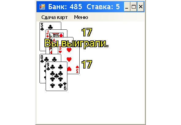 Банкомёт, к нашей радости, набирает также 17 очков. Согласно правилам, при равенстве очков победителем считается тот, кто первым набрал это количество очков, т.е. игрок. И мы видим приятное для нас сообщение «Вы выиграли». Это правило можно перепрограммировать в приведённой далее программе, установив, например, неизменность Банка при ничьей. В верхней части экрана Банк увеличивается на величину Ставки в нашу пользу.