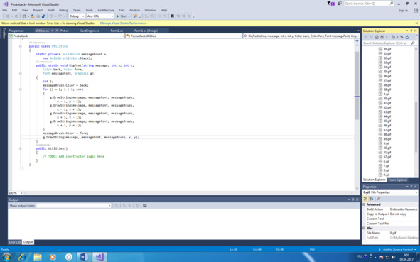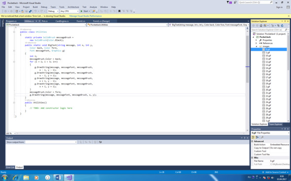 Создаём проект по обычной схеме: в VS в панели New Project мы выбираем Templates, Visual C#, Windows Classic Desktop, Windows Forms App (.NET Framework), в окне Name записываем имя проекта PocketJack и щёлкаем OK. Это имя проекта далее будет использоваться в программе. Поэтому, если в окне Name мы запишем другое имя проекта, отличное от PocketJack, то в приведённой далее программе в строках кода по загрузке графических и звуковых файлов, а также имя пространства имён во всех наших файлах (кроме Form1.cs) необходимо будет заменить PocketJack на новое имя.