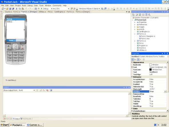 Аналогично, как первую, проектируем вторую форму и вводим элемент управления в виде окна TextBox. Чтобы в это окно можно было записать многострочный текст, в панели Properties (для этого элемента) в свойстве Multiline выбираем значение True (рис. 1.32).