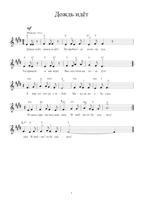 ДОЖДЬ ИДЁТДождь идёт, дождь идёт —Не пробьётся солнца луч,Ты пришла и нас ждётВыход солнца из-за туч!Припев: А мне хочется с тобой Никуда не убегать, И здесь, прямо под дождём, «Я люблю!» тебе сказать.Ты спешишь, говоришь:«От дождя бы убежать.Ну что, милый, стоишь —Не могу тебя понять!»Посмотри, фонарюОчень грустному одному.Хочешь, я подарюЭту песенку ему? Припев.Дождь идёт, дождь идётИ смывает все следы,Ты пришла и нас ждётСолнце, лето впереди!