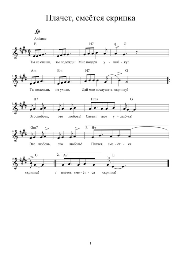 ПЛАЧЕТ, СМЕЁТСЯ СКРИПКА!Ты не спеши, ты подожди! —Мне подари улыбку!Ты подожди, не уходи,Дай мне послушать скрипку! Припев: Это любовь, это любовь! Светит твоя улыбка! Это любовь, это любовь! Плачет, смеётся скрипка!Словно просвет, словно рассветНад головою милой,Это вопрос, это ответ —Как без тебя любимой?!Я не хочу, я не могуБольше без дивной скрипки!Я не могу, я не могуЖить без твоей улыбки!Мне бы с тобой, рядом с тобой,С нежной твоей улыбкой,Это любовь, это любовь!Сердце поёт, как скрипка!Жду тебя днём, жду тебя в ночь —Нужно озвучить строчки.Ты приходи, чтобы помочь,Чтобы поставить точки!
