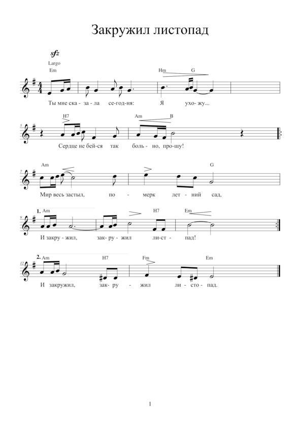 ЗАКРУЖИЛ ЛИСТОПАДТы мне сказала сегодня:– Я ухожу.Сердце, не бейся так больно —Прошу!Припев: Мир весь застыл, Померк летний сад, И закружил, закружил Листопад!Да, я один, я одинВиноват,Что стал пустым и холоднымТвой взгляд. Припев.Кончился, канул,Как в Лету, роман,Было и не было,Словно туман. Припев.Верю, надеюсь:Ты снова придёшь,Мне постучишь,Позвонишь, позовёшь. Припев.Как без надежды,Родная, прожить?Как не поймёшь,Что нам нужно спешить?