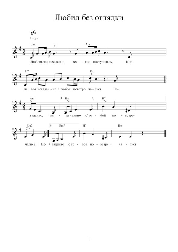ЛЮБИЛ БЕЗ ОГЛЯДКИЛюбовь так нежданноВесной постучалась,Когда мы негаданноС тобой повстречались.Негаданно, негаданноС тобой повстречались!И лето летело,И солнце сияло,И птицы нам пели, 2р.И море шептало.Хоть осень украдкойПод утро ступала,Любил без оглядки – 2р.Мне всё было мало.Но это случилось —Зима вдруг настала,Твой взгляд безучастный 2р.Холодный, усталый.Тебе, словно птице,Нужна даль иная,Не стану я биться, 2р.Тебя заклиная.Любовь так нежданноВесной постучаласьИ так же негаданноЗимой попрощалась.Негаданно, негаданноЗимой попрощалась.