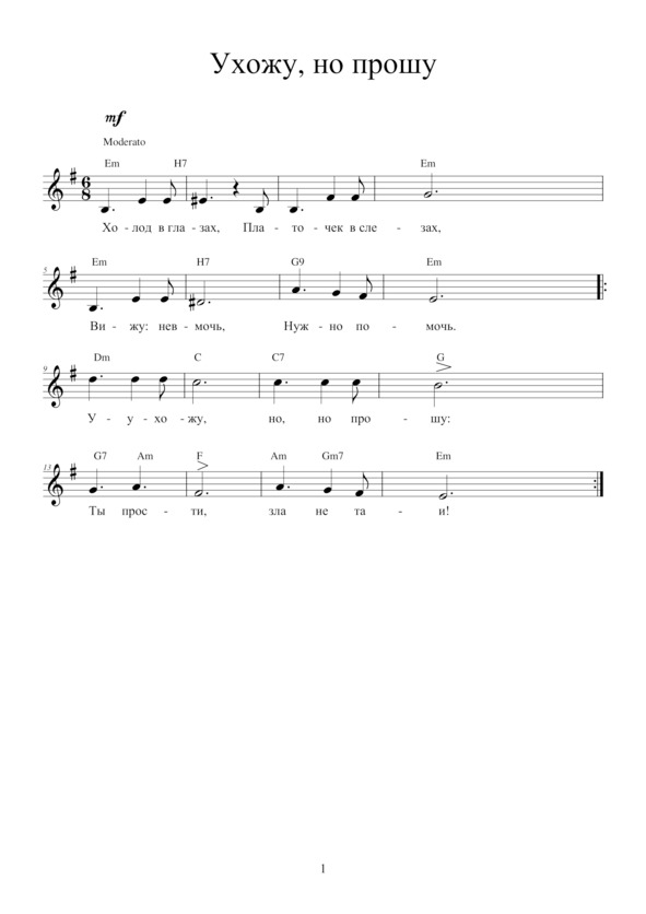 УХОЖУ, НО ПРОШУХолод в глазах,Платочек в слезах,Вижу: невмочь,Нужно помочь.Припев: Ухожу, но, но прошу: Ты прости, зла не таи…Без, без любви,Ты, ты – пойми!Жизнь не та,Жизнь пуста!.. Припев.Без, без тебя —Мне нельзя!Без, без тебя —Как без огня! Припев.Мир обойду,Но, но найдуКлючик твой…Ключик золотой!Припев: Я верну, отыщу, Я любовь твою воскрешу!