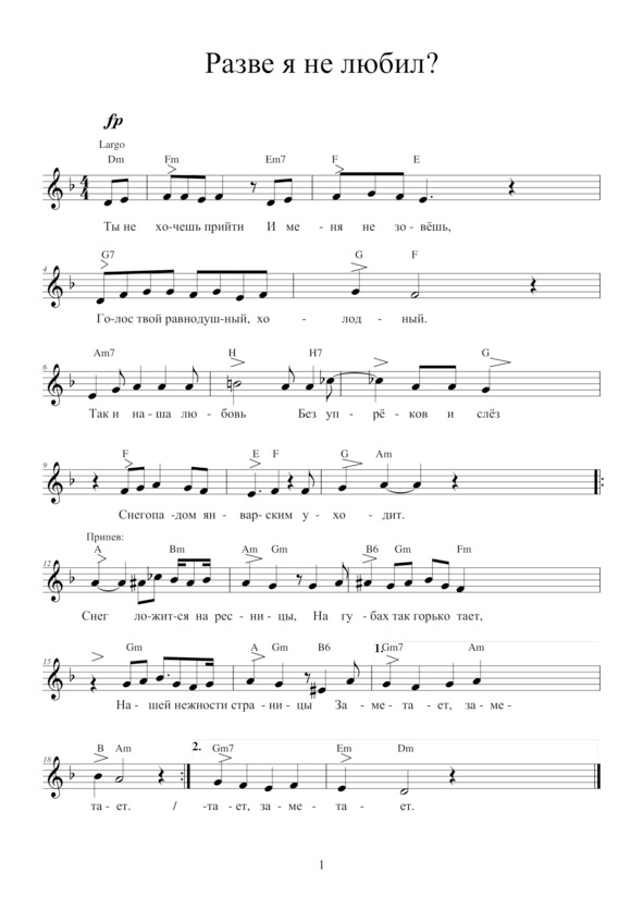 РАЗВЕ Я НЕ ЛЮБИЛ?Ты не хочешь прийтиИ меня не зовёшь,Голос твой равнодушный, холодный —Так и наша любовь —Без упрёков и слёз —Снегопадом январским уходит. Припев: Снег ложится на ресницы, На губах так горько тает, Нашей нежности страницы Заметает, заметает…Ты устала так жить:День за днём меня ждать —Прилетит или нет ненаглядный?Что теперь говорить,Оправданья искать —На душе у меня так неладно. Припев.Разве я не любил,Разве я не спешил!Из полёта к тебе прилетая.Что поделаешь тут —Соловьи не поютВ клетке – будь она золотая.