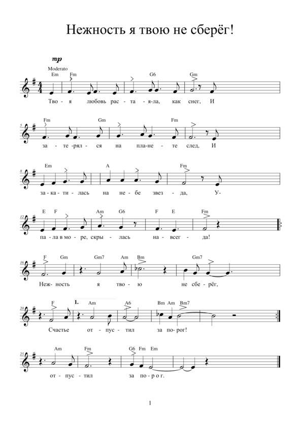 НЕЖНОСТЬ Я ТВОЮ НЕ СБЕРЁГТвоя любовь растаяла, как снег,И затерялся на планете след,И закатилась на небе звезда,Упала в море, скрылась навсегда.Припев: Нежность я твою не сберёг, 2 р. Счастье отпустил за порог!Звонят в душе моей колокола —В ней всё сгорело, выжжено дотла!И, может быть, услышав их набат,Ты сможешь время повернуть назад. Припев.И если ты вдруг попадёшь в беду,Ты позови меня – и я приду!Ты только руку мне навстречу протяни,Как прежде, с нежностью взгляни.