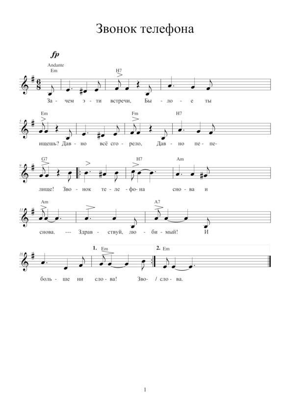 ЗВОНОК ТЕЛЕФОНАЗачем эти встречи,Былое ты ищешь?Давно всё сгорело,Давно пепелище!Припев: Звонок телефона снова и снова: Здравствуй, любимый! — и больше ни слова…Ты дай мне забыться,Забыть дай утрату,Не береди…Не надо возврата! Припев.Ну, что может выжить,И, где ещё тише? —Трава не растёт жеНа том пепелище!