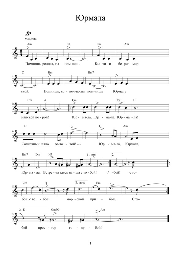 ЮРМАЛАПомнишь, родная, ты помнишьБалтии берег морской,Помнишь, конечно, ты помнишьЮрмалу майской порой.Припев: Юрмала, Юрмала, Юрмала — Солнечный пляж золотой — Юрмала, Юрмала, Юрмала, Встреча здесь наша с тобой! С тобой, с тобой, морской прибой! С тобой, с тобой, простор голубой!Волны, смеясь, целовалиЛёгкий твой девичий след,Чайки над морем кричали,Нам посылая привет. Припев.Сосны вверху трепетали,В небо хотели взлететь,Солнце и ветер играли —Больно аж было смотреть! Припев.