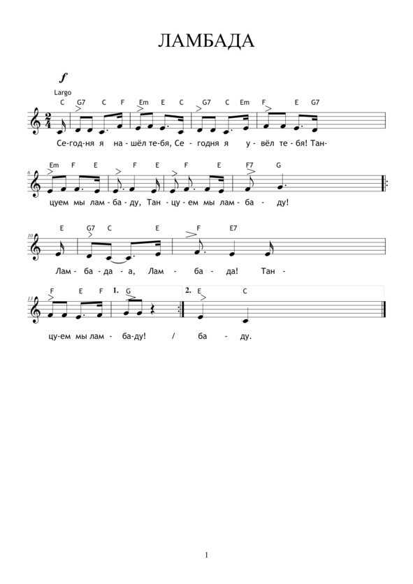 ЛАМБАДАСегодня я пришёл не зря, —Сегодня я увёл тебя! —Танцуем мы ламбаду,Танцуем мы ламбаду! Припев: Ламбада, ламбада!.. Танцуем мы ламбаду, Танцуем мы ламбаду!Глаза твои – ну, как огни!И мне ты, Лада, рада…Сотри, сотри помаду,Сотри, сотри помаду!Мне губы жжёт твой алый рот,Но здесь… но здесь народ!Танцуем мы ламбадуТанцуем мы ламбаду! Припев.И просишь ты: сорви цветы —Фиалки за оградой…– Нет, нет! Нельзя, не надо,Их рвать и красть не надо!Теперь, как быть – ведь не забытьМне глаз твоих, о Лада!Зовёт нас, ждёт ламбада,Зовёт нас, жжёт ламбада!