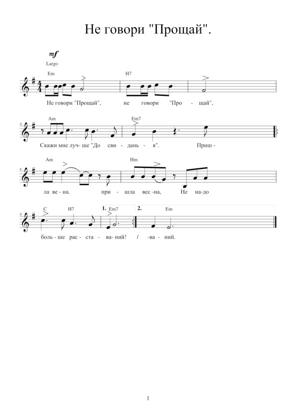 НЕ ГОВОРИ «ПРОЩАЙ»Не говори «прощай», не говори «прощай»,Скажи мне лучше «до свиданья», —Пришла весна, пришла весна —Не надо больше расставаний.Ты посмотри в окно на хоровод берез,На птичьи клинья в поднебесье —Пришла весна, пришла весна —Давай ей радоваться вместе.Смотри: земля не спит, смотри: она спешитВоспрянуть снова в птичьих песнях —Пришла весна, пришла весна —Давай же с ней и мы воскреснем.Ты позабудь пургу и стужу декабря,Забудь обиды и напасти, —Пришла весна, пришла весна,А с нею, может быть, и счастье.Не говори «прощай», не говори «прощай»,Скажи мне лучше «до свиданья», —Пришла весна, пришла весна —Не надо больше расставаний.