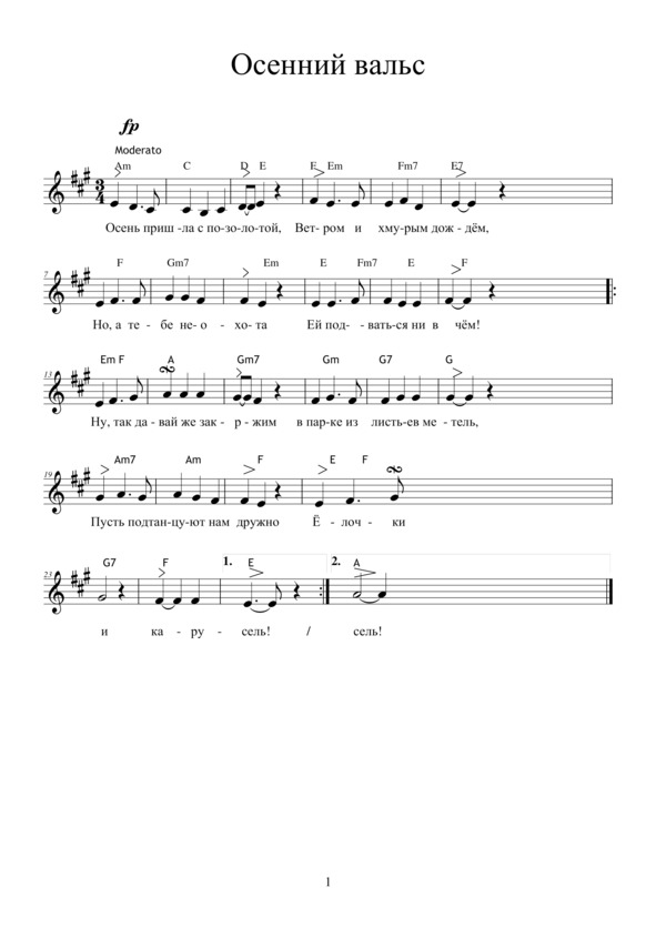 ОСЕННИЙ ВАЛЬСОсень пришла с позолотой,Ветром и хмурым дождём,Но, а тебе неохотаЕй поддаваться ни в чём! Ну, так давай же закружим В парке из листьев метель, Пусть подтанцуют нам дружно Ёлочки и карусель!Может быть, всё обойдётся —Выглянет солнечный луч,Может, и лето вернётся —Вырвется – бабье – из туч? Ну, так давай же закружим В радуге листьев метель! Пусть подтанцуют нам дружно Ёлочки и карусель!Ты так легка и свободна,В вальсе летишь – всё поёт!Ты так красива сегодня —Кто там, сияя, идёт? Это же лето вернулось — Смотрит, любуясь, на нас! Осень, спеша, обернулась, Скрылась, танцуя наш вальс!