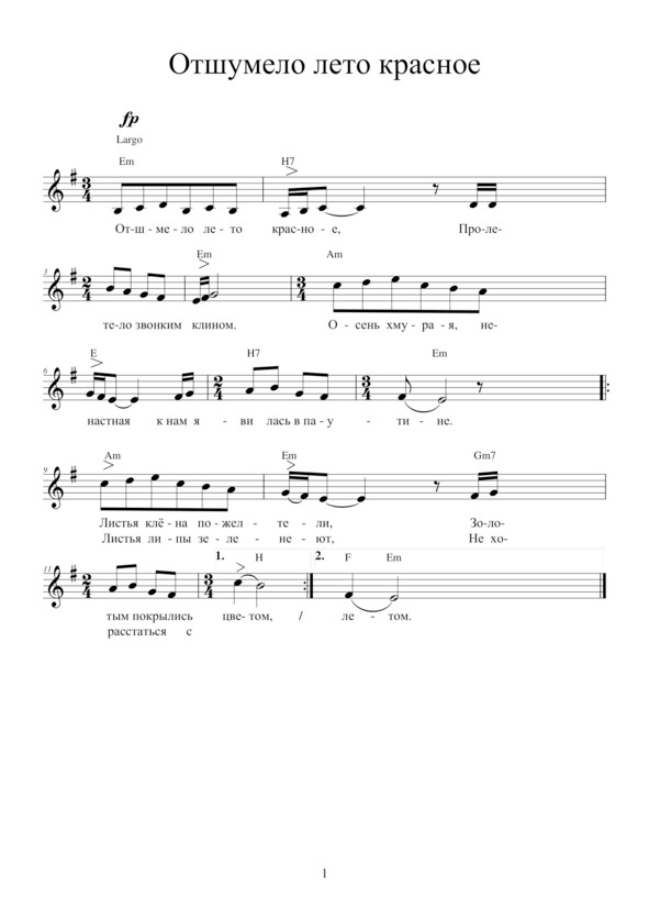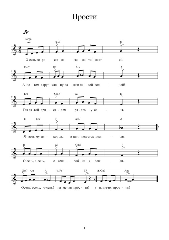 ПРОСТИ!Осень ворожила золотой листвой,А потом вдруг хлынула дождевой волной.Так давай присядем рядом у огня,Я возьму аккорды в такт под стук дождя. Припев: Осень, осень, осень — зябкие дожди, Осень, осень, осень — ты меня прости!Ты прости за ветер в шалой голове,Что любил я лето в скошенной траве,Не тянулся в струнку, «шишкою» не сталИ твои надежды я не оправдал.Что на повороте подвела судьбаИ в позёмке белой потерял тебя,А потом ни тропки, не видать пути…Ну, прошу, родная, ты меня прости! Припев.Ты прости за верность, что тебе хранил,Глаз твоих озёрных я не позабыл,Хоть стоял у бездны на её краю…Ты прости, родная, что тебя люблю!
