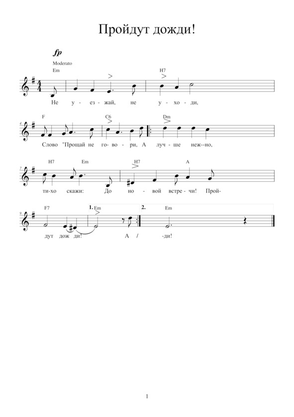 ПРОЙДУТ ДОЖДИ!Не уезжай,Не уходи,Слово «Прощай»Не говори, Припев: А лучше нежно, тихо скажи: До новой встречи — Пройдут дожди!Не обещай,Что вдалекеБудешь писать,Скучать обо мне. Припев.Знай, дорогойМой человек,Я без тебя —Планета без рек. Припев.