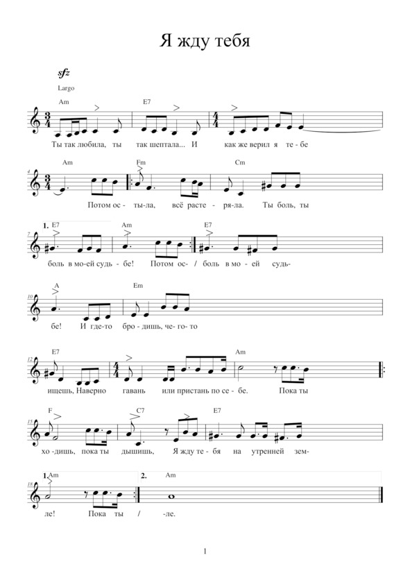 Я ЖДУ ТЕБЯТы так любила,Ты так шептала…И, как же верил я тебе!Потом остыла,Всё растеряла…Ты боль, ты боль в моей судьбе! Припев: И где-то бродишь, Чего-то ищешь, Наверно, гавань или пристань по себе. Пока ты ходишь, Пока ты дышишь, — Я жду тебя на утренней земле!Здесь ты играла,Здесь ты смеялась,Как зайчик солнечный в окне.Здесь, повторяя,Мне признавалась,Что любишь, любишь! – в тишине. Припев.Ушло с тобойОчарованье.Нет света в будущем моём,И только боль,Воспоминанья —В душе проносятся огнём!
