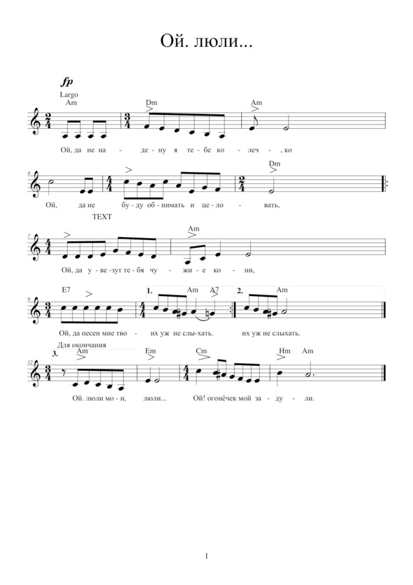 Ой, да не надену я тебе колечко,Ой, да не буду обнимать и целовать,Ой, да увезут тебя чужие кони,Ой, да песен мне твоих уж не слыхать.Припев:Ой, люли мои, люли…Ой, огонёчек мой задули.Ой, да выйду я да тёмной ночью,Ой, да всё смотрю в твоё оконце,Ой, да слёзы душат – нету мочи,Ой, да выглянь, выглянь, моё солнце!Припев.Ой, да не надену я тебе колечко,Ой, да ноженьки не буду целовать,Ой, да увезут тебя чужие кони,Ой, да глазонек твоих мне не видать.Припев.