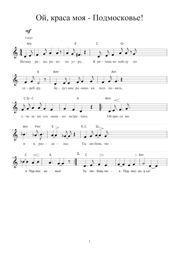 ОЙ, КРАСА МОЯ – ПОДМОСКОВЬЕ!Встану рано-рано поутру,К реченьке пойду по серебру,Будут травы ноги мне мочить,Солнышко вставать и мне светить.Припев: Ой, краса моя и раздолье! Ты земля моя – Подмосковье!!!У реки на иве средь ветвейТронет дрёму свистом соловей,Дробью вдруг пройдётся по кустам,Трелью вознесётся к облакам! Припев.Лес умытый будет зазыватьНа хмельных полянах погулять —Земляника зреет, ждёт родник,Чтоб испить водицы я приник! Припев.Всё знакомо здесь и близко мнеНа моей родимой стороне.Даль без края… Колокол гудит —Звон хрустальный по Руси летит!