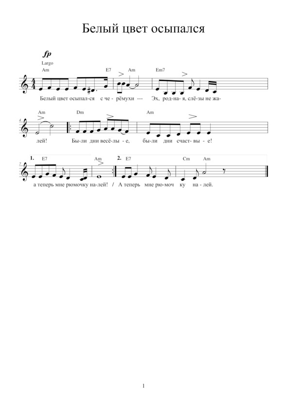 БЕЛЫЙ ЦВЕТ ОСЫПАЛСЯБелый цвет осыпался с черёмухи —Эх, родная, слезы не жалей!Были дни весёлые, были дни счастливые,А теперь мне рюмочку налей.Выйду ночью поздно за околицу —Птица что-то жалобно поёт,Вспоминаю Машу раскрасавицу,Губы и походочку её.Как гуляли этим лунным бережком,Как шуршала смятая трава,Обнимал её за плечи бережно,И шептала Маша: «Я твоя…»Как потом прощались зорькой раннею,Целовались у того плетня,Петухи вовсю уже горланили,Замирало сердце у меня!Белый цвет осыпался с черемухи —Эх, родная, слёзы не жалей!Были дни счастливые, были дни весёлые,А теперь мне рюмочку налей!