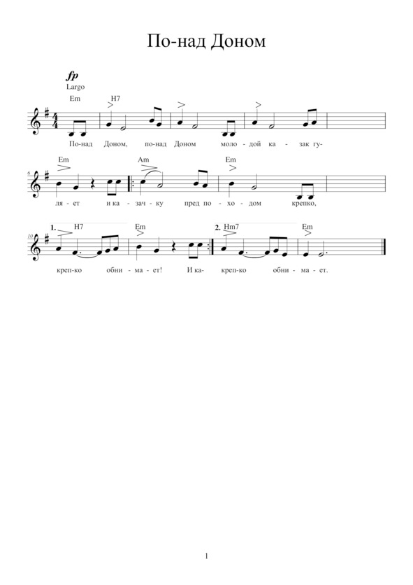 ПО-НАД ДОНОМПо-над Доном, по-над ДономМолодой казак гуляетИ казачку пред походомКрепко, крепко обнимает.А наутро у кордонаСшиблись лавы лошадей,Шашки свищут, хрипы, стоны,Пули бьют верней, верней.Конь буланый, черногривый,С белой меткой на виске,Прощевай, мой конь ретивый,Смерть нашла меня в седле.Эх, земляк мой, после бояТы предай меня земле,А коня возьми с собою —Будет память обо мне.По-над Доном, по-над ДономТот казак, эх! не гуляет,А казачка поёт песню —Сердце, сердце замирает!