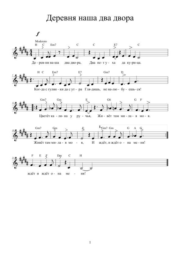 ДЕРЕВНЯ НАШАДеревня наша два двора,Два петуха и курица,Когда с гулянки – да с утра —Глядишь – не налюбуешься!Припев: Цветёт калина у ручья, Живёт там милая моя, Живёт там милая моя И ждёт, и ждёт она меня!Когда иду, иду я к ней,К моей, моей красавице,Берёзки рады, рады мне,Стоят вокруг, смущаются! Припев.И никуда ты от меня,Зазнобушка, не денешься.Вот накоплю деньжонок я —И мы с тобой поженимся!