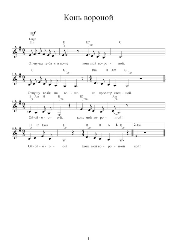 КОНЬ ВОРОНОЙОтпущу тебя я в поле,Конь мой вороной,Отпущу тебя на волюНа простор степной!Припев: Ой-ой-ой… 2 р. Конь мой вороной!Ты пасись себе там в полеВо траве густой,Ты скачи широким долом,Конь мой вороной!Отпущу тебя на волю,Конь мой вороной,Послужил ты мне довольно,Конь мой боевой! Припев.А когда тебе я свистну,Друг мой боевой,Может, ты ко мне примчишься,Конь мой вороной!