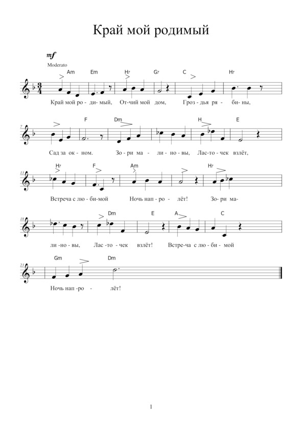 КРАЙ МОЙ РОДИМЫЙКрай мой родимый,Отчий мой дом,Гроздья рябины,Сад за окном.Припев: Песня малиновки, Ласточек взлёт! Встреча с любимою Ночь напролёт!Небо бескрайное —Синь с голубым,Рощица дальняяС полем родным,Здесь моё детство,Юность моя.Здесь моя зрелость,Любовь здесь моя!Дети здесь выросли,Внуки растут —Новые порослиЖизни вокруг.Вновь расцветаетСад за окном,Вновь оживаетРодителей дом!