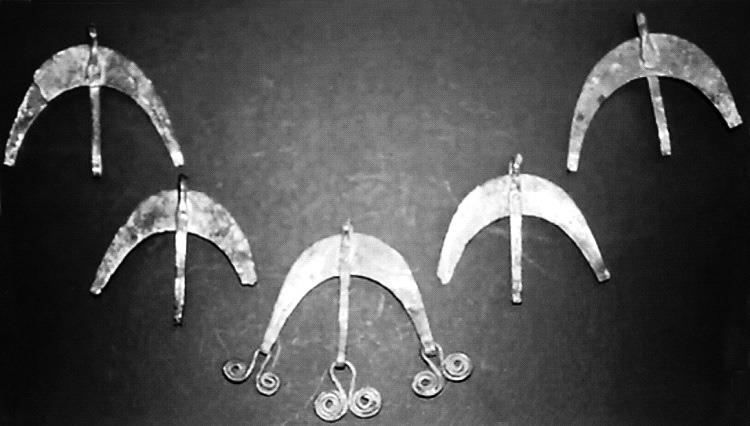Выполнены в виде «ясных» (световидных) соколов, летящих в небо, спиралевидные подвески на крыльях и хвосте – знаки восхода и захода солнца.