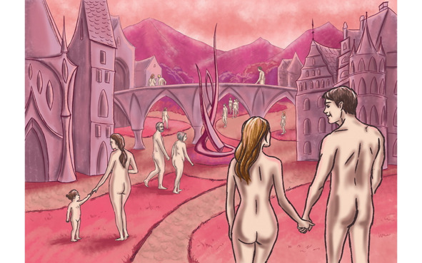 Странной показалась бы окружающая обстановка. На улицах не было никакого транспорта. Плотный людской поток не спеша хаотично фланировал по чистеньким улочкам, по ковровым газончикам, не разбирая дороги и в неопределенных направлениях. Как броуновское движение молекул. И, уж совсем необычно – все люди (если это люди) были обнаженными. И грудные младенцы, и изящные в своей молодой эстетичной пластике юноши и девушки, и согбенные старцы. Все прогуливались словно на нудистском пляже в чем мать родила. И их лица, под стать окружающему миру, светились счастьем, покоем и умиротворением.