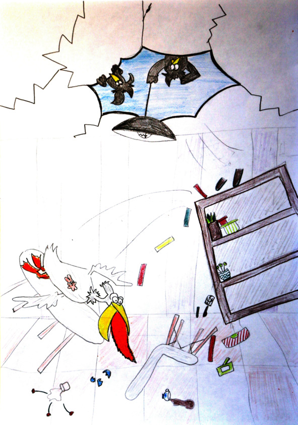 Вороны заглянули в дыру в крыше. Пеликан лежал в куче поломанной мебели, из его большого клюва торчал рыжий хвост.