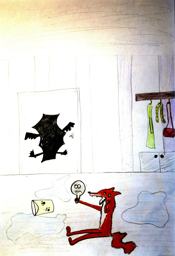 Пеликан выскочил из дома, проделав дыру в двери. Лиса посмотрела в свое отражение в сковородке и изумилась.