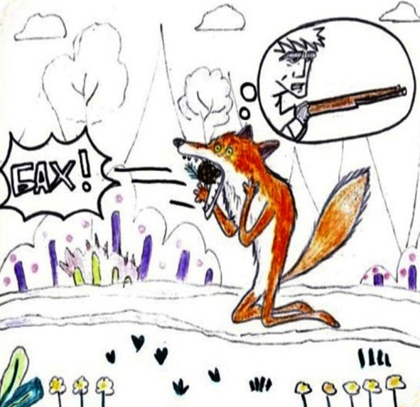 Рыжехвостая притаилась возле дома зайцев, ожидая поймать кого-нибудь из косых. Бурун не растерялся: достал из портфеля рогатку, вложил в нее сосновую шишку. Прицелившись, выстрелил. Шишка, отрикошетив от ближайшей сосны, влетела прямо в рыжую пасть. Вместе с шишкой в горле Лисы застряли все слова, которые затем слились в один звук, напоминающий жужжание пчелиной пасеки. Лиса не поняла, что произошло в этом тихом лесу и, убегая, представляла страшную картину: злого охотника с двустволкой, который снова прицелился и вот-вот выстрелит из второго ствола. Его у Буруна не было, зато вокруг валялось много еловых шишек, и маленький охотник послал вслед Лисе несколько из них.