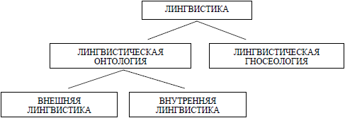 Лингвистическая онтология – учение о бытии языка, а лингвистическая гносеология – учение о способах его познания. В свою очередь, внешняя лингвистика отличается от внутренней тем, что в первой язык изучается в связи с другими, неязыковыми, объектами, а во второй он исследуется как таковой. Но каждая из указанных областей знаний имеет свою научно-отраслевую структуру.