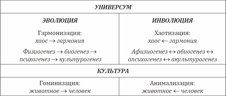 Физиогенез, биогенез, психогенез и культурогенез не существуют сами по себе. Они находятся в отношениях коэволюции. Они представляют собою разные формы единого процесса – эволюции. Но существуют и аналогичные формы инволюции. Воспользовавшись латинской приставкой «а-», подобной нашей «не-», мы можем назвать эти формы афизиогенезом, абиогенезом, апсихогенезом и акультурогенезом.