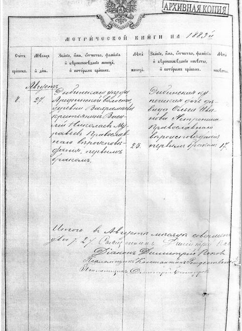 Запись о венчании Василия Николаева Муравьева и Ольги Ивановой Нетрониной в метрической книге Казанского храма города Рыбинска.