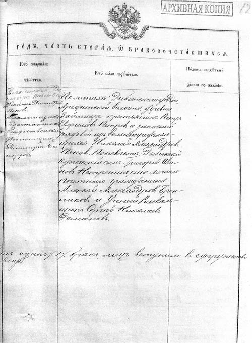 Имена поручителей по жениху и невесте в метрической книге Казанского храма города Рыбинска.